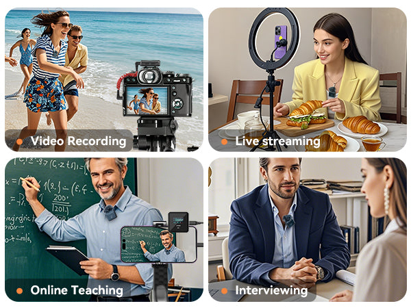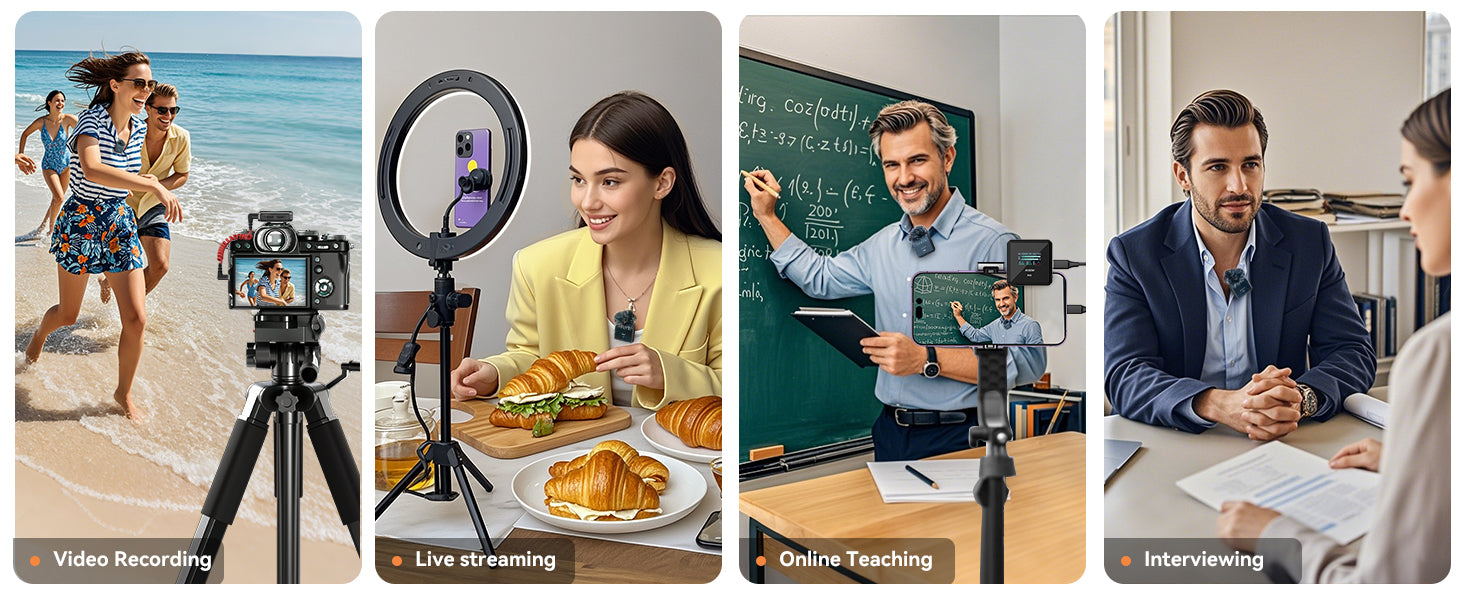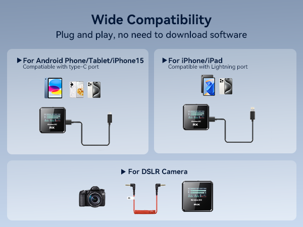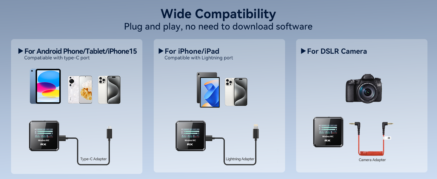 NANK wireless clip on microphone is equipped with three types of connection cables (Camera/Type-C/Lightning), which can be connected to Tablet, Android phones, iphone, cameras and other devices.