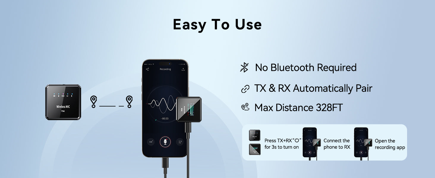 Nank Mike Pro picks up sound through the built-in microphone and sends the audio signal to the receiver through wireless transmission. The receiver is usually connected to a camera, cell phone or recording device. This allows the user to move around freely without being restricted by cables.