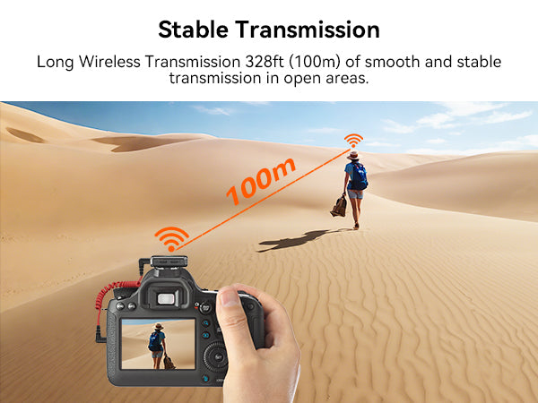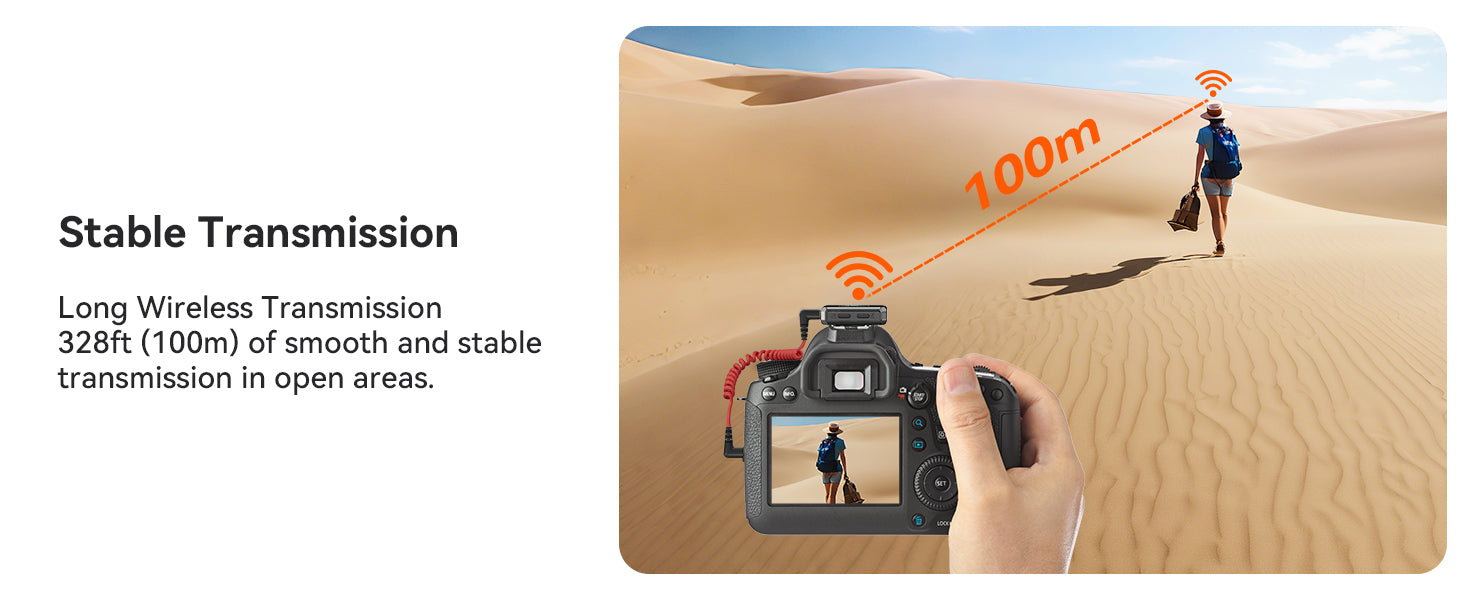 In open, unobstructed environments, the maximum transmission distance from a single microphone to the receiver is 328ft(100m),TX-RX-TX is 656ft(200m).