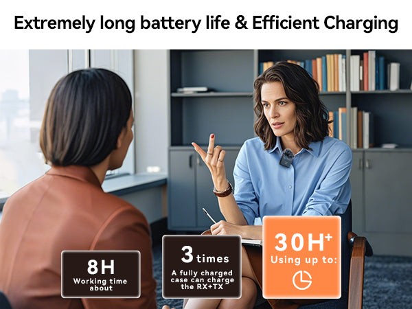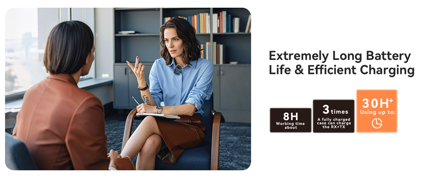 The charging time of the whole set of equipment is about 5 hours. The use time of a single transmitter is 8 hours, and the charging compartment can charge TX+RX 3 times. The total use time can reach 30 hours.