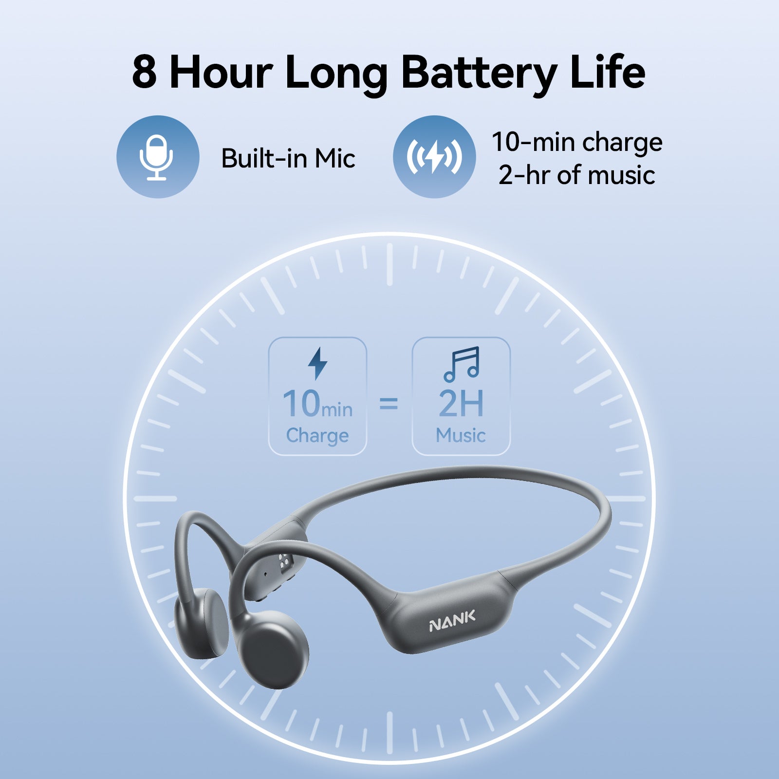 Nank Runner Diver bone conduction headphones are equipped with Bluetooth 5.3 high-performance chips, with faster connection speed and lower delay, bringing you high-decoding music.