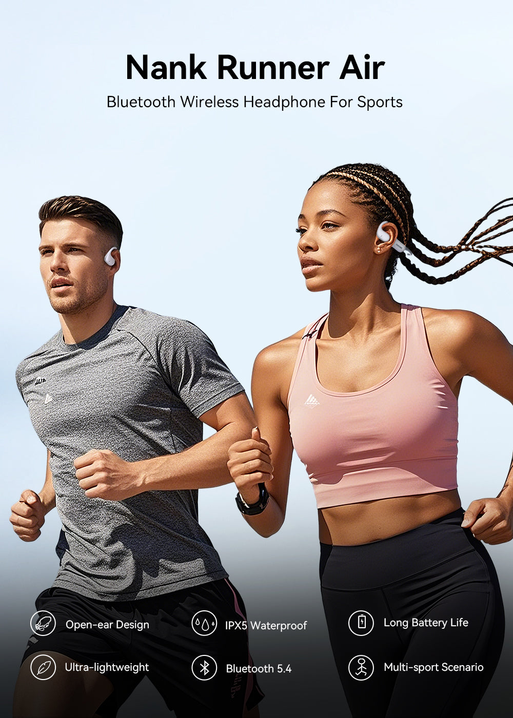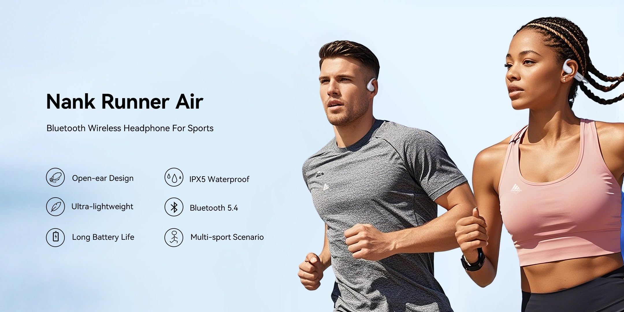 O Nank Runner Air é um par de fones de ouvido leves e abertos, projetados para esportes e uso diário.